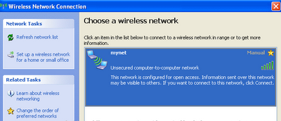 - Kalau kedua komputer sudah disetting seperti langkah di atas, langkah selanjutnya adalah tinggal mengkoneksikannya yaitu dengan masuk ke Network Connection, kemudian klik kanan pada Wireless Network Connection --> pilih View available wireless networks.Disana akan tampil SSID dengan nama mynet, sorot dengan mouse kemudian klik tombol Connect. Tunggu beberapa saat sampai statusnya Connected.
